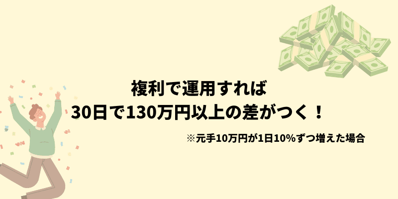 トレードを繰り返すたびに投資元本がどんどん大きくなるので、資金が少なくても、時間が経過すれば多くの利益を得られる可能性があります。