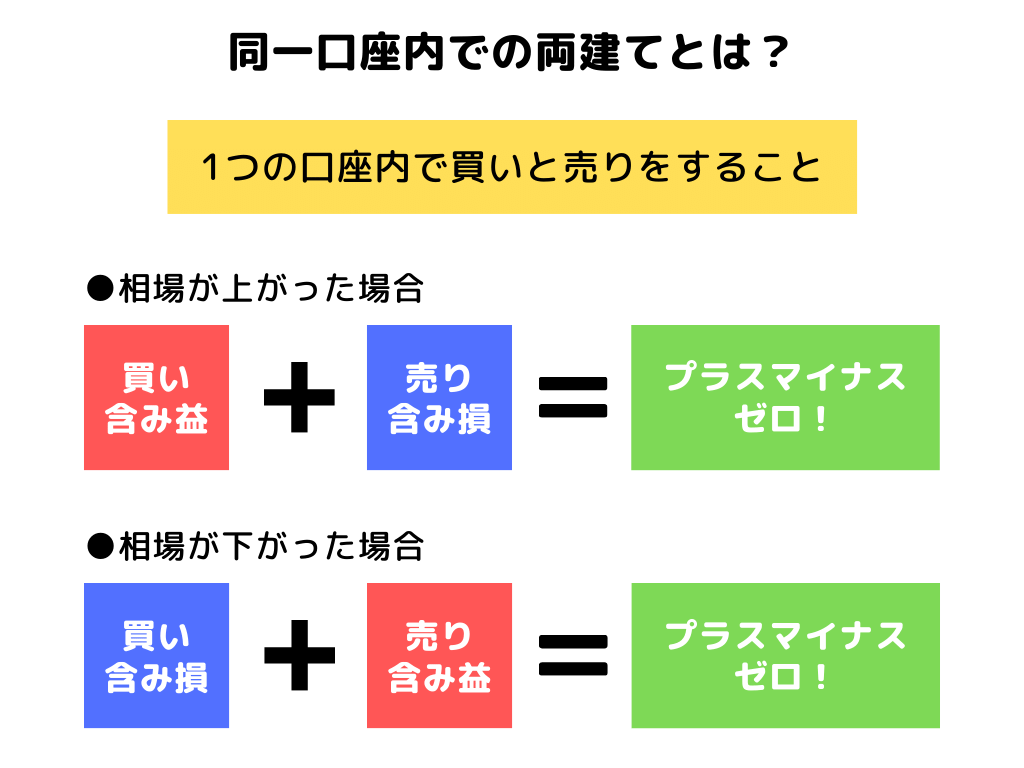 両建てをすれば、相場がどちらに動いても一方の含み益がもう一方の含み損を打ち消し、損益が発生しない状況をつくれます。