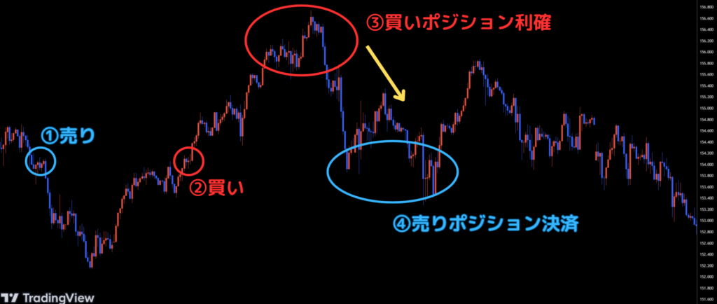 下図の例では、②で保有した買いポジションを③で利益確定し、①で保有した売りポジションの含み損が解消される④で決済するのが効果的です。