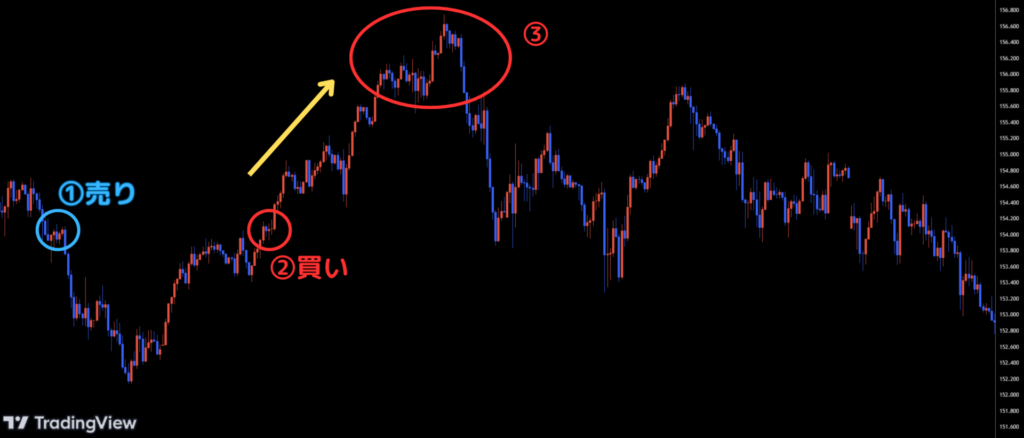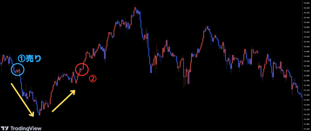 下図のように、①で売りエントリーをした場合、②で買いエントリーをすればチャートの上昇とともに③まで含み益を伸ばせます。