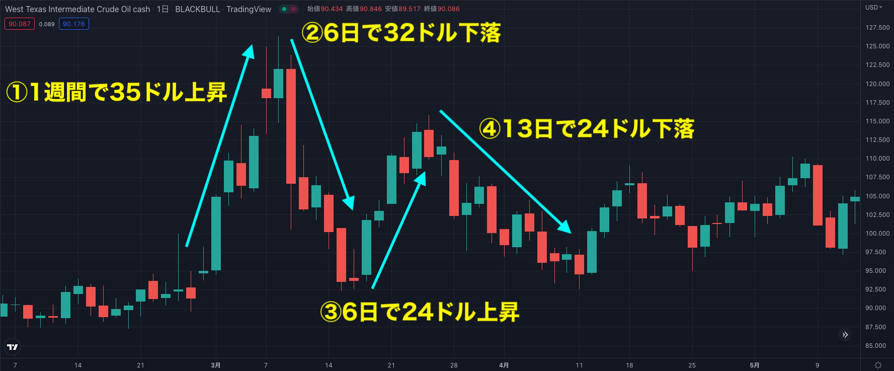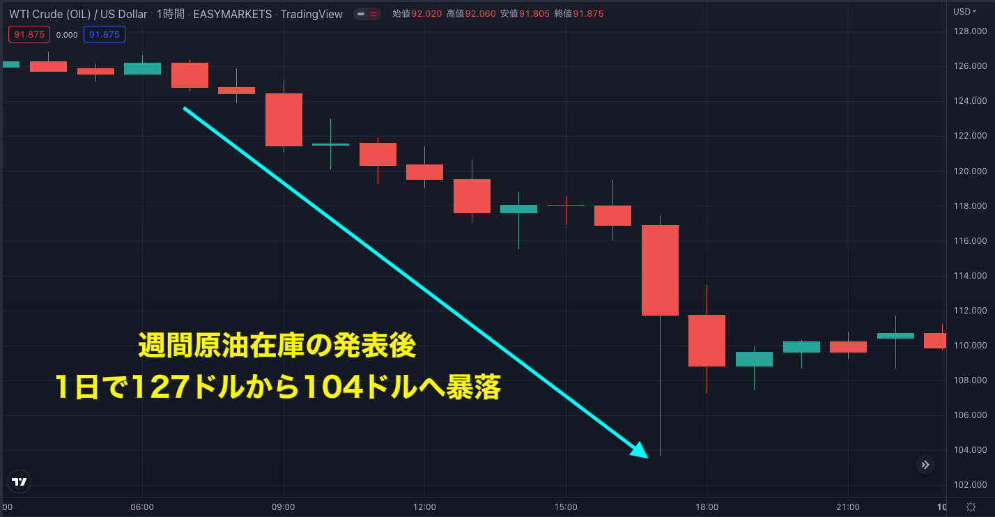 実際に2022年3月9日に週間原油在庫が発表された時には、高値は約127ドルでしたが底値は約104ドル。一日のうちに23ドルほども変動が見られました。