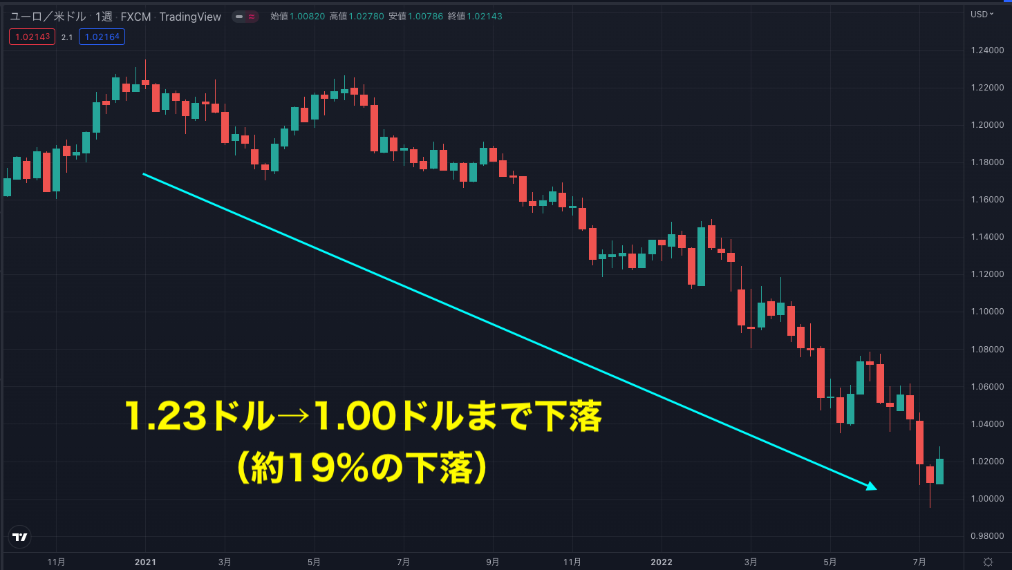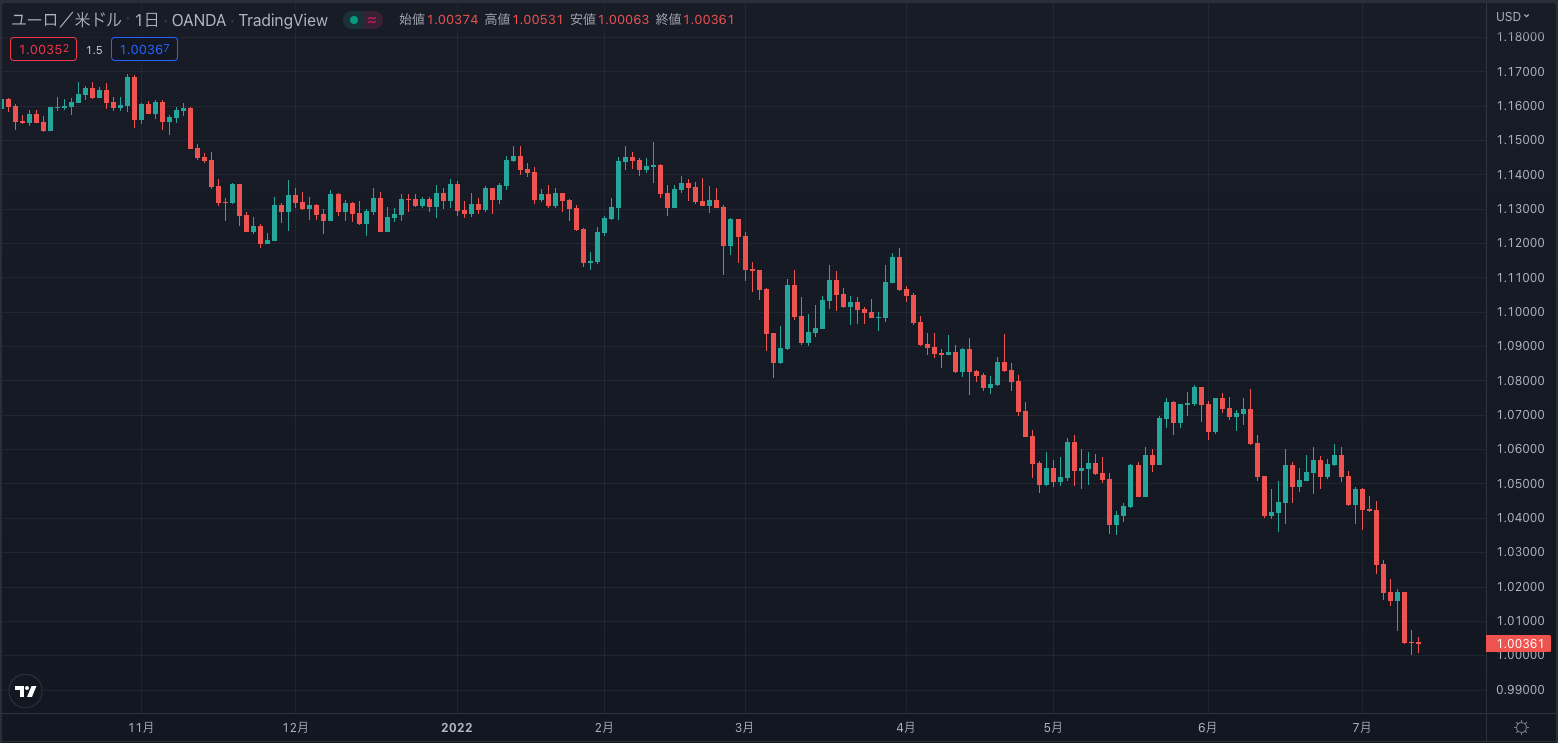 2022年1月時点では1.13ドル付近で推移していましたが、3月以降は強い下降トレンドが形成され、2022年7月15日時点ではついに1.0ドル付近まで下がりました。