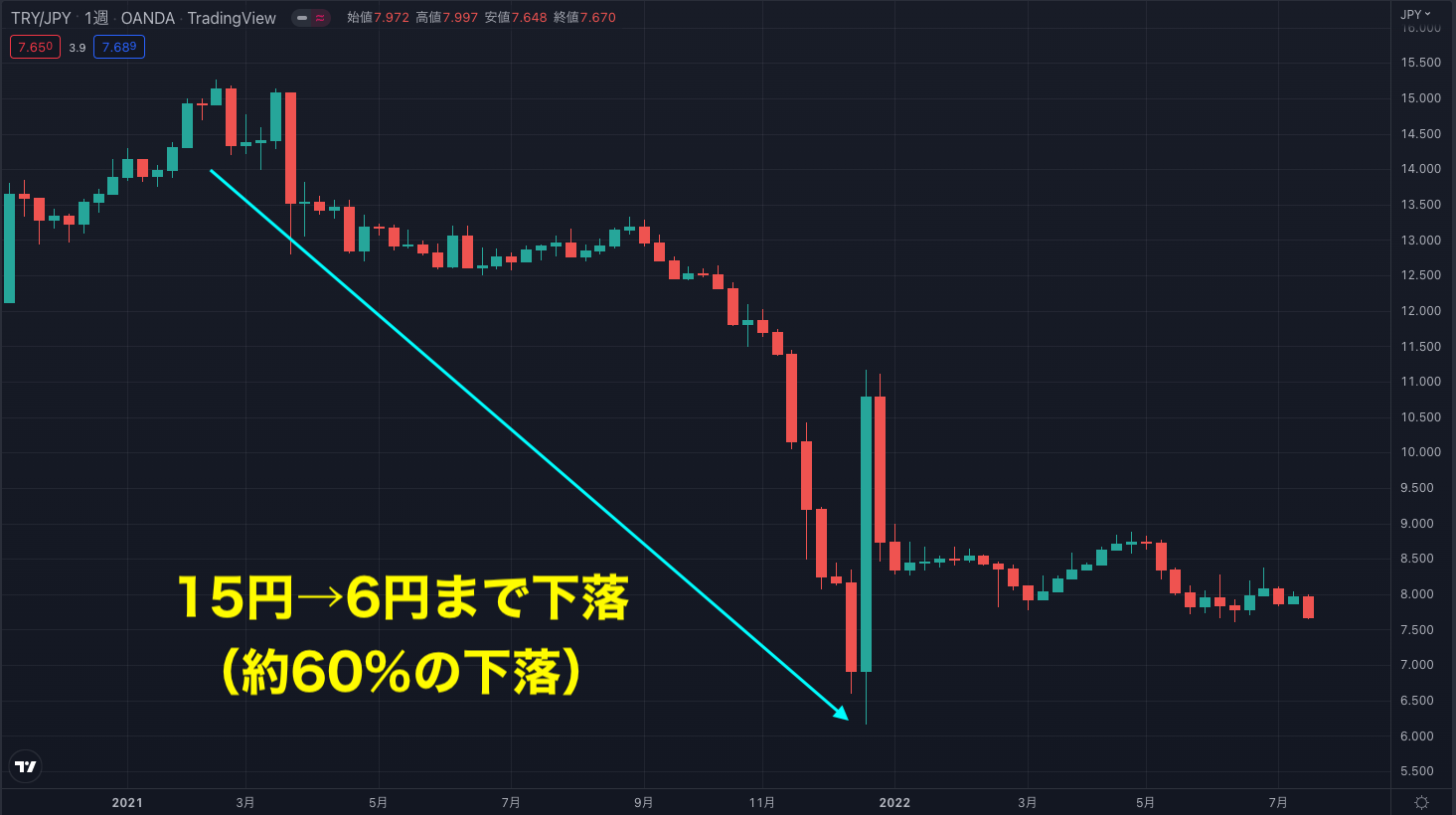 TRR/JPY(トルコリラ/円)は、60%も下落しており、下落幅はEUR/USD(ユーロドル)よりも大きいといえます。