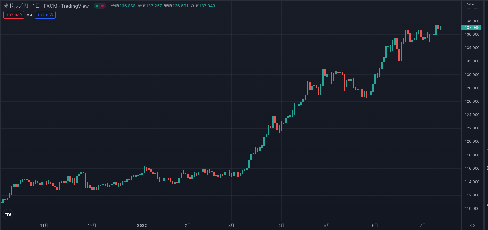 以下は、2022年1月~7月15日の日足チャートです。