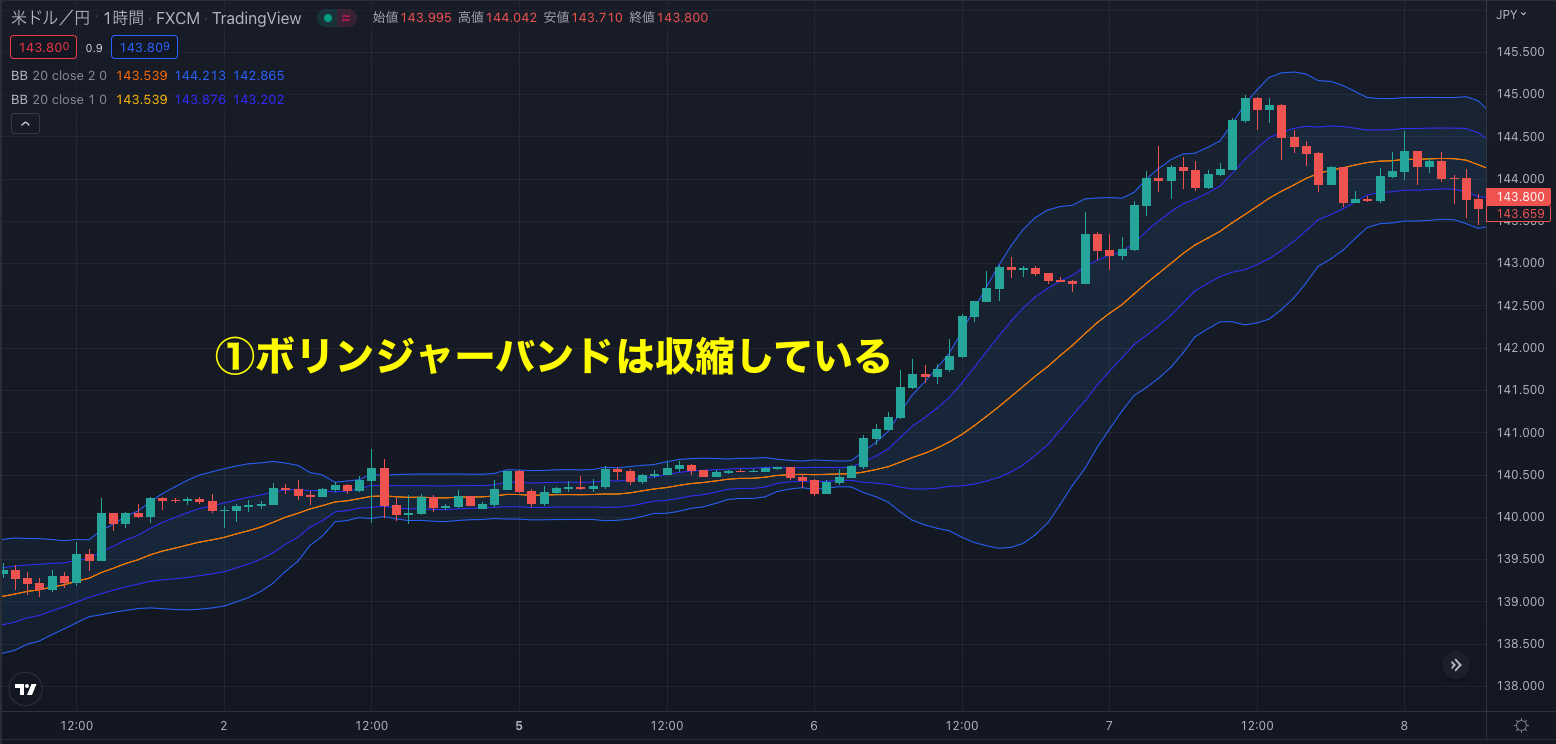 2.バンドが大きく広がり、価格が急変したらエントリー