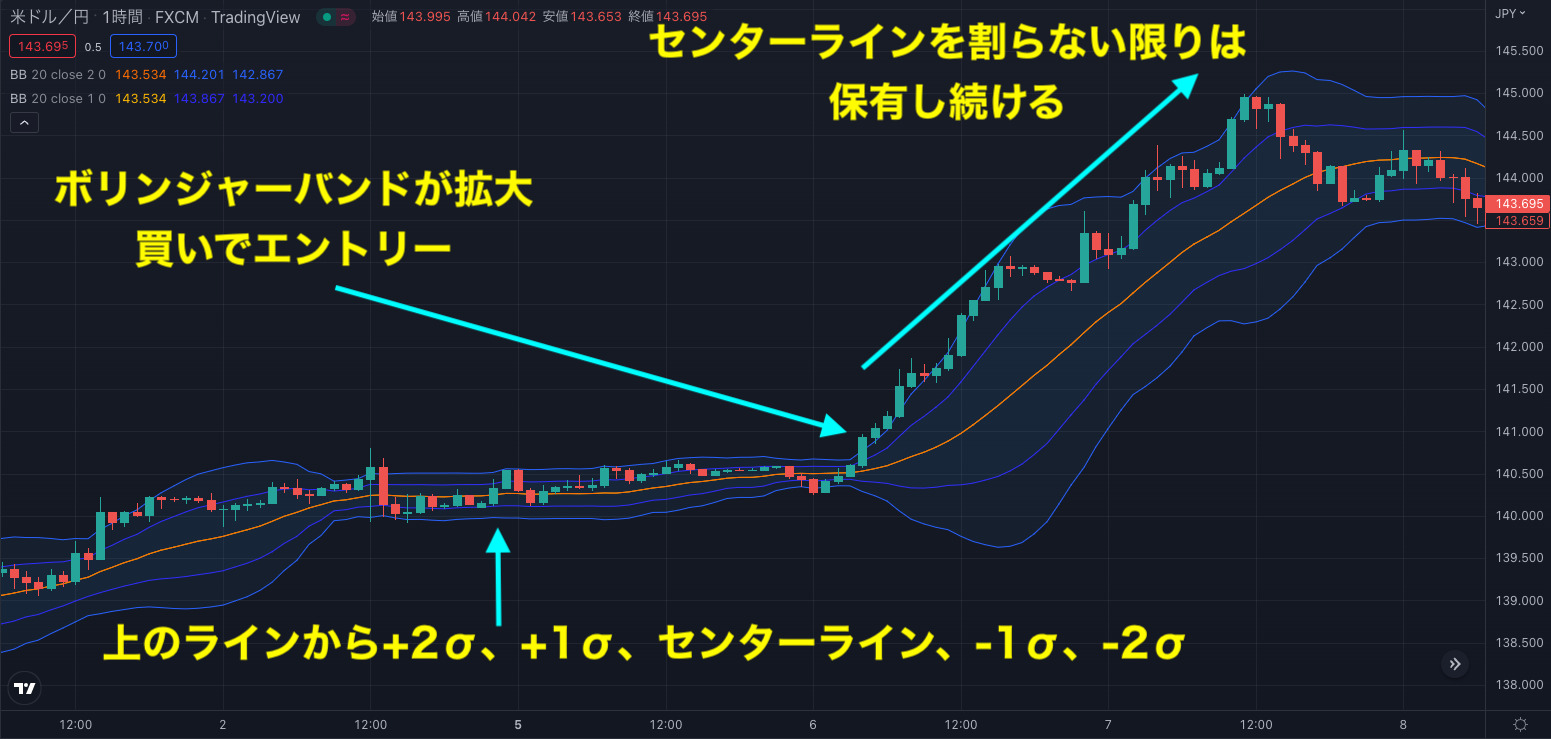 エントリー後は、価格がセンターラインを下回らない限り、ポジションを保有し続けます。