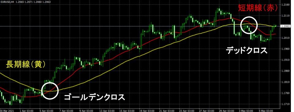 また、2〜3本の移動平均線を組み合わせて使うケースも多く、下図のゴールデンクロスやデッドクロスで売買方向を判断する使い方もあります。