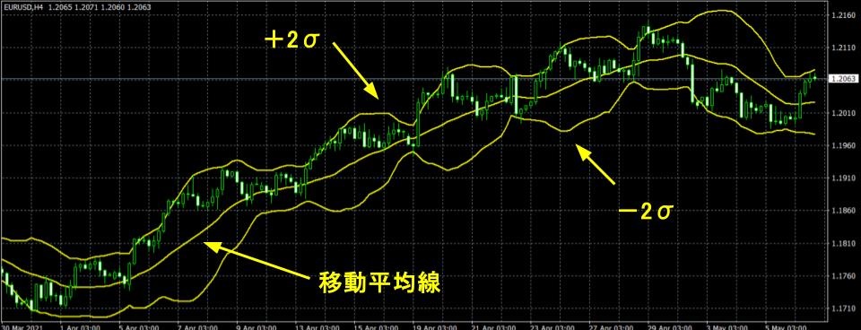 ボリンジャーバンドは、移動平均線と2本の標準偏差で構成されているトレンド系インジケーターです。