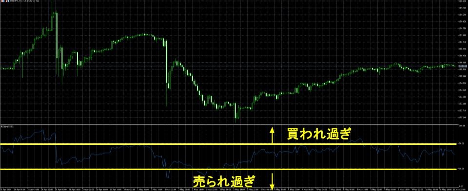 具体的には、RSIの数値が70%を超えると買われ過ぎ、30%を下回ると売られ過ぎと判断します。