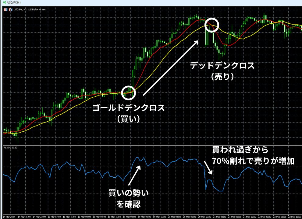 下図のように、移動平均線の短期線が長期線を下から上に突き抜けるゴールデンクロスを確認後、RSIが30%以上(売られ過ぎ)を示したら、買いエントリーをするチャンスです。
