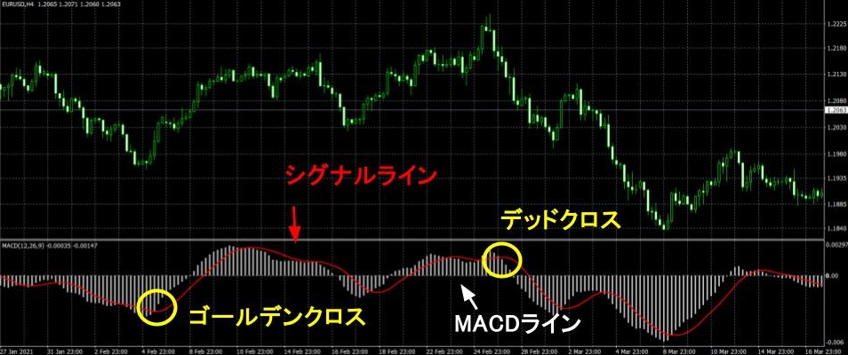 | ゴールデンクロス | MACDラインがシグナルラインを下から上へ抜けた | 買い |