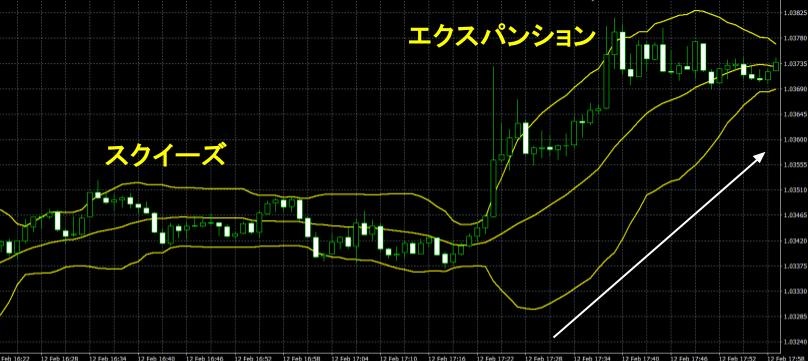具体的には、下図のようにバンドが収縮している「スクイーズ」が見られた後、バンドが拡大する「エクスパンション」が発生したら、ローソク足の伸びた方向への動きが加速しやすくなります。