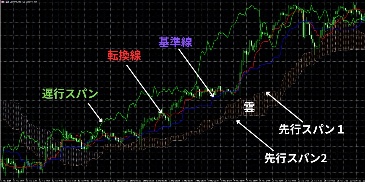 日本で開発されたインジケーターのため、MT4上では「Ichimoku Kinko Hyo」と表示されています。