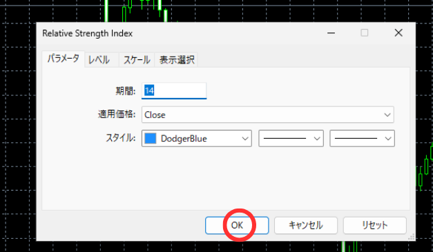 RSIの設定画面が表示されるので、必要に応じて調整し、「OK」をクリックします。