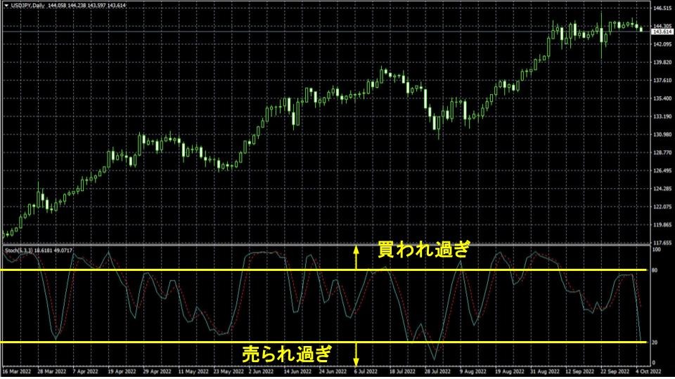 下図のSlow%Dラインの動きを見ることで、相場の過熱感を把握できます。