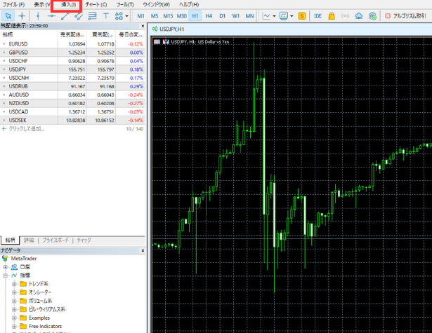 MT4を再起動し、上部メニューの「挿入」から「インジケーター」を選択後、追加したインジケーターを選択すればチャートに表示されます。