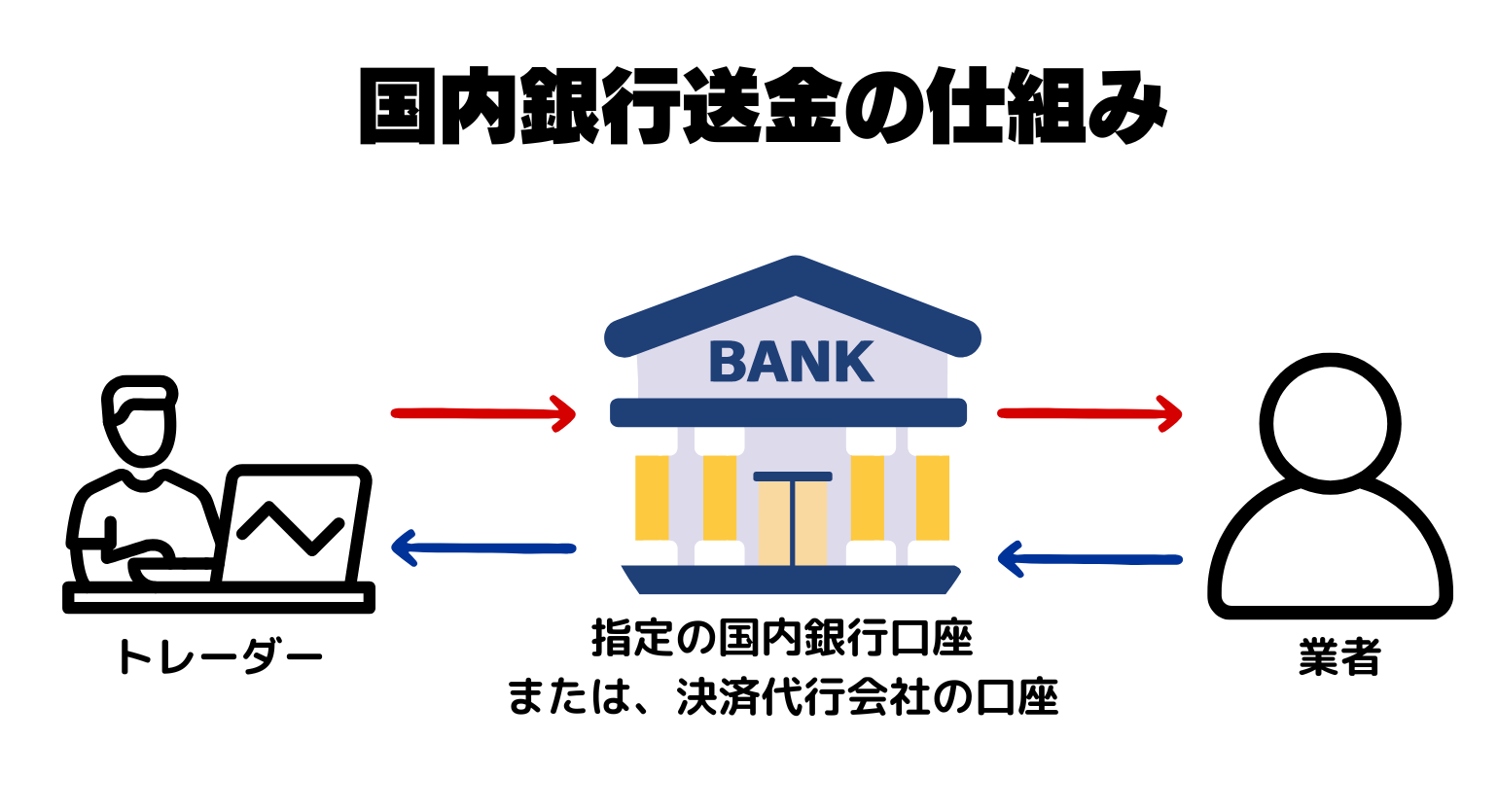 国内銀行送金とは、海外FX業者が指定する国内銀行口座や決済代行会社の口座との間で送金する方法です。
