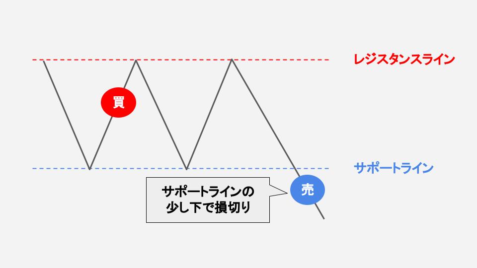 しかし、価格がサポートラインを下に抜けると一気に下落することが多いため、買いエントリーをしていた場合は、サポートラインの下に損切りラインを設定するようにしましょう。