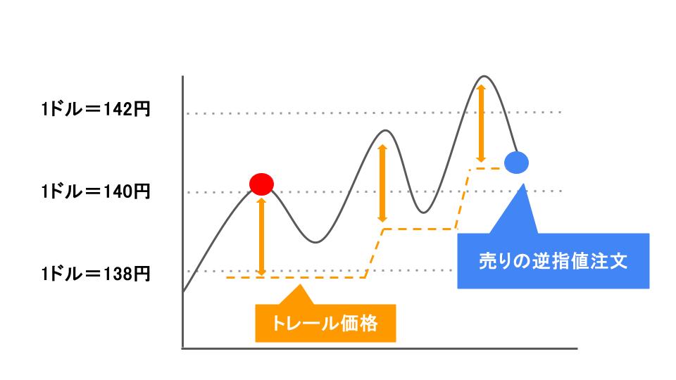 トレーリングストップ注文とは、有利な方向への価格変動に対して逆指値注文の指定価格が自動で修正される注文方法です。