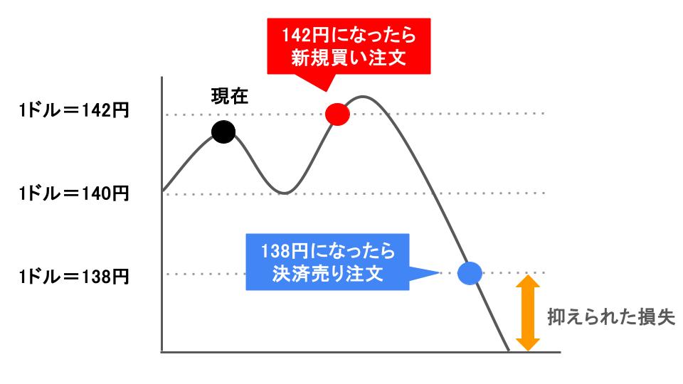 一方、相場が不利な方向に動いたときは、逆指値注文の価格は変動せず、逆指値の価格に到達すると自動的に決済されます。