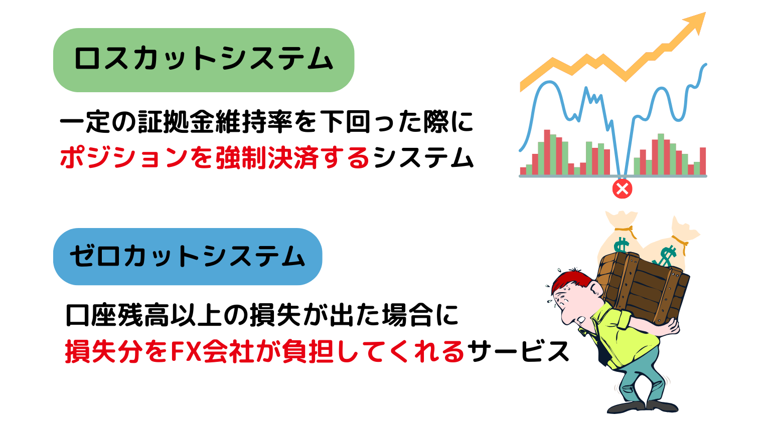 ゼロカットシステムとは、口座残高以上の損失が出た場合に損失分をFX会社が負担してくれるサービスのことです。