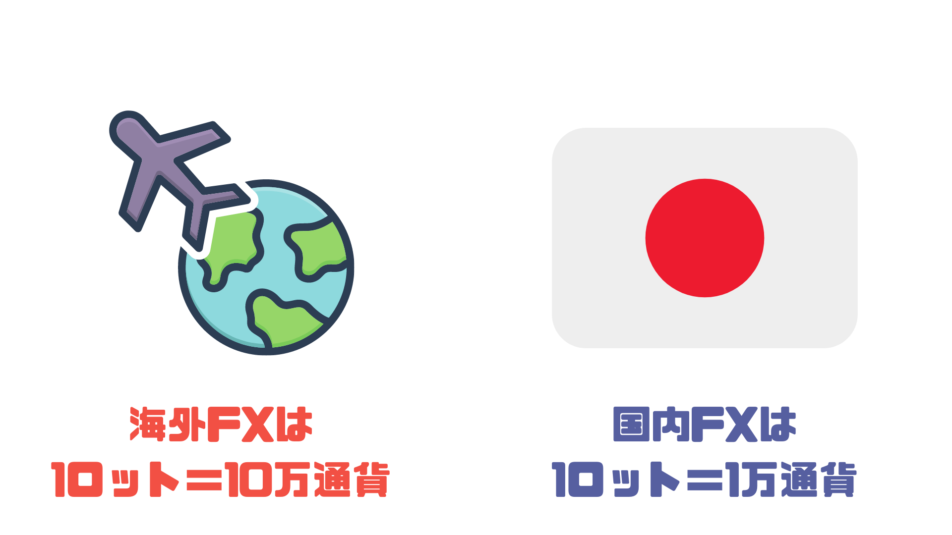 国内FX業者では1ロットを1万通貨、海外FX業者では10万通貨を1ロットとしているケースが多いです。