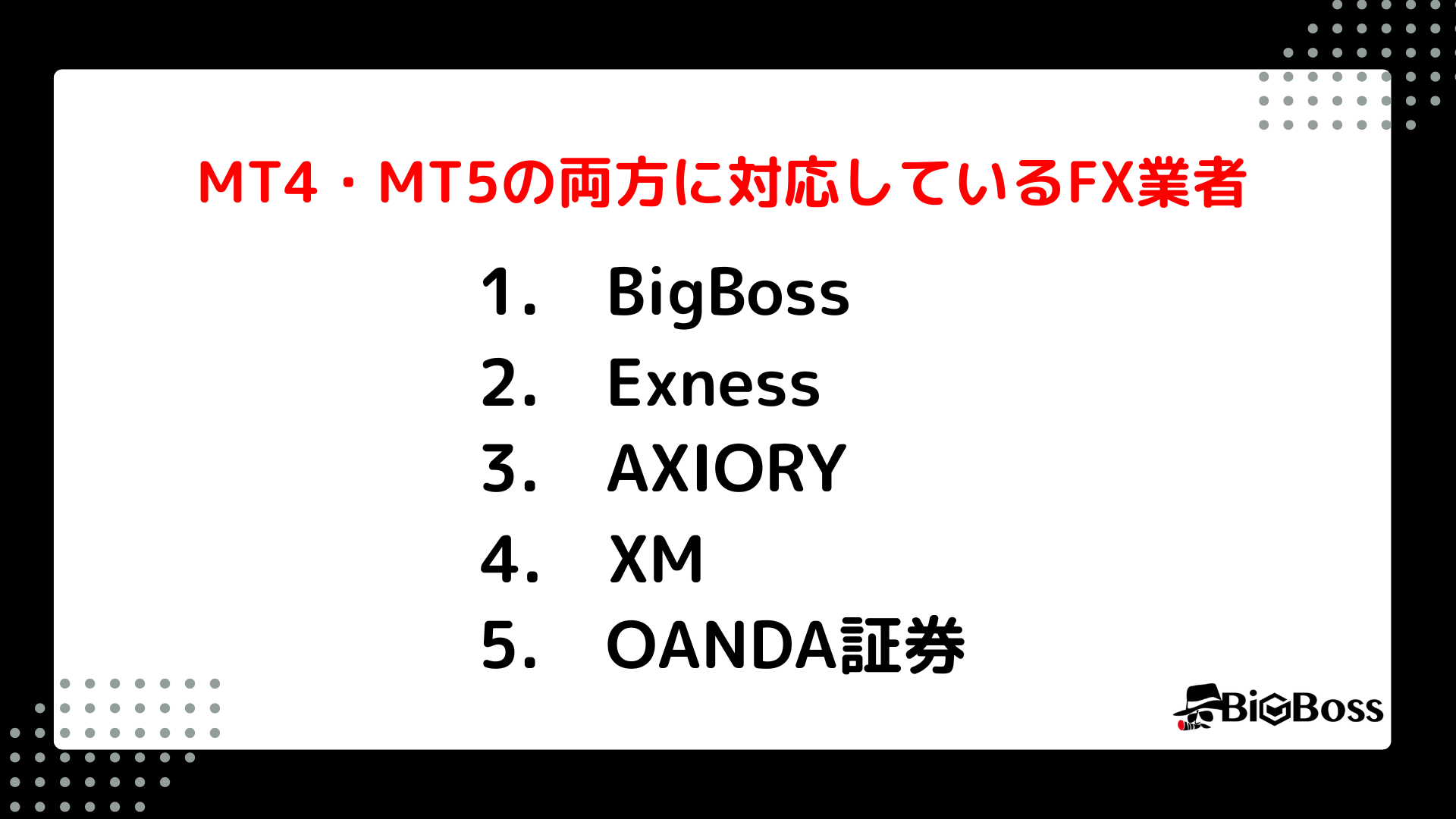 MT4とMT5の両方に対応しているFX業者を探しているなら、BigBossがおすすめです。