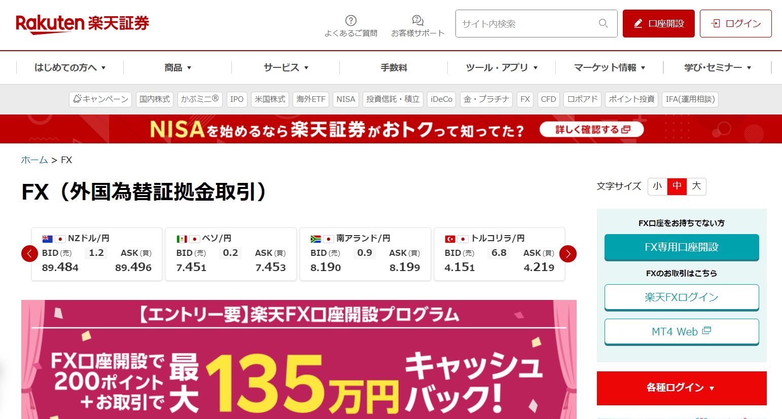 | その他のキャンペーン | ・口座開設で200ポイント+取引で最大135万円キャッシュバック |