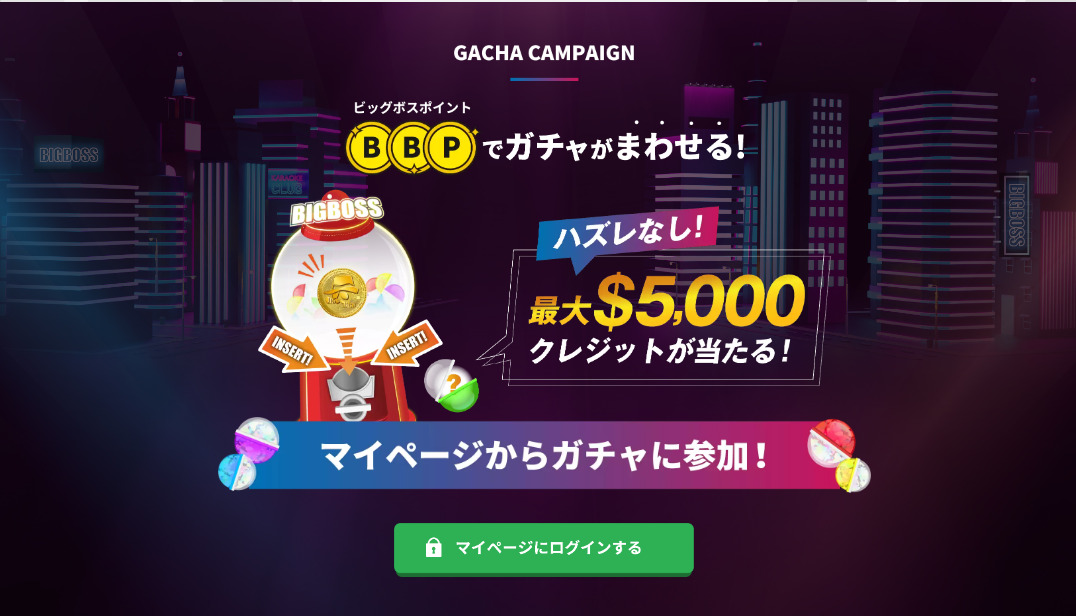 BigBossのガチャはハズレがなく、最大5,000ドル分のクレジットを獲得できます。