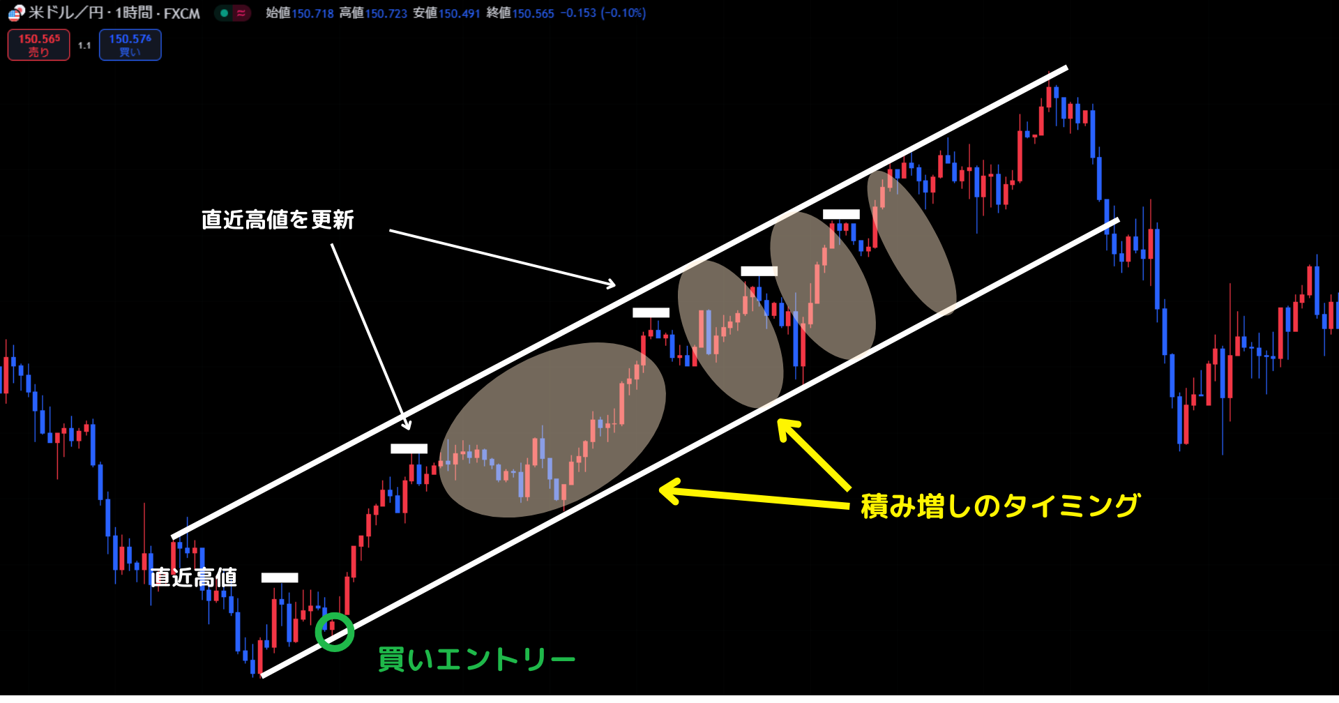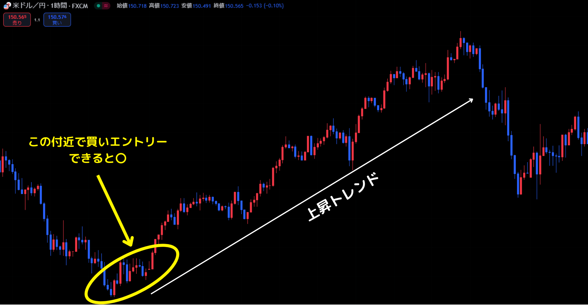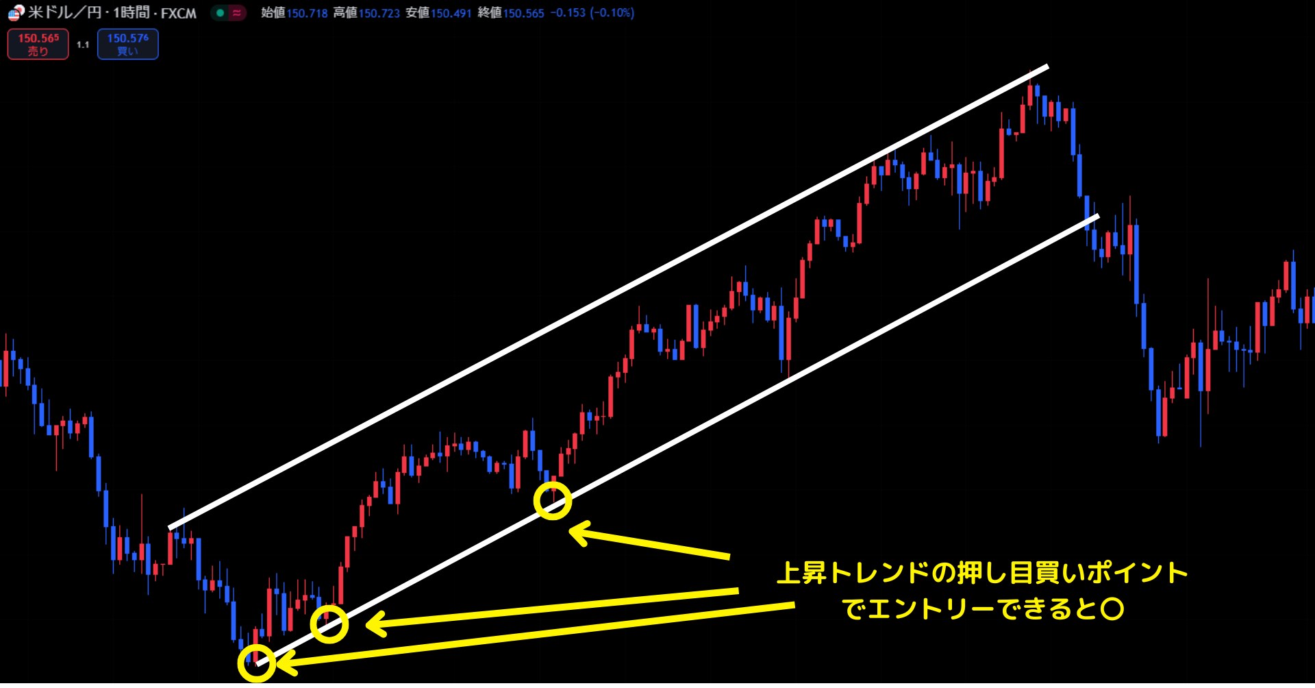 具体的にどのポイントでエントリーするかというと、既にトレンドが発生している場合は「押し目買い」と「戻り売り」を意識しましょう。