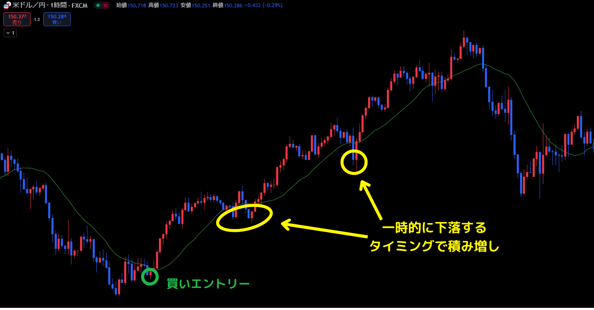 よって、上昇トレンドの場合、大きく上昇した後、調整で移動平均線付近に戻ってきたタイミングで積み増しをします。