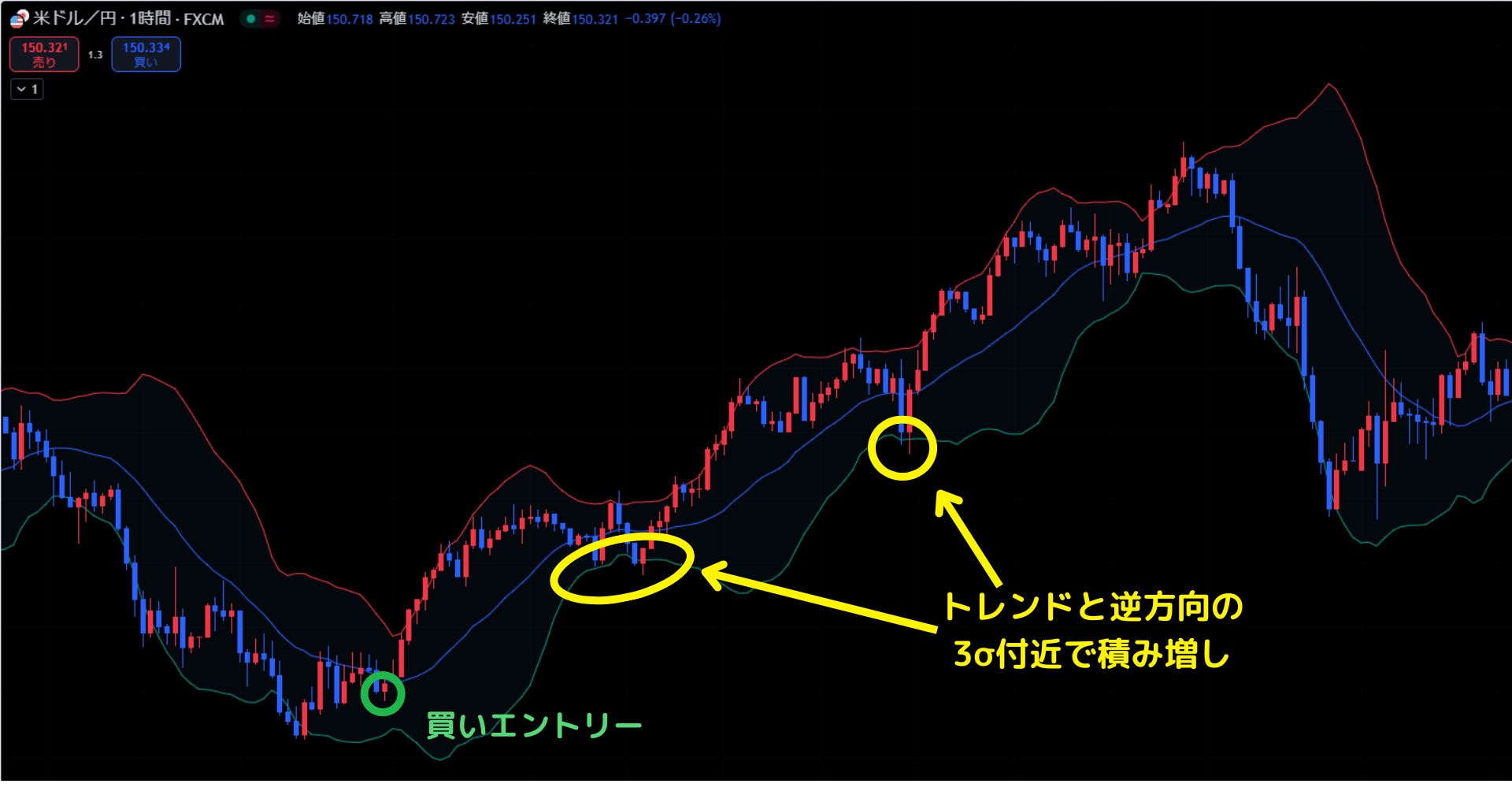 ボリンジャーバンドの場合、一時的にトレンドの方向と逆に値動きした±2もしくは3σ付近で積み増しします。