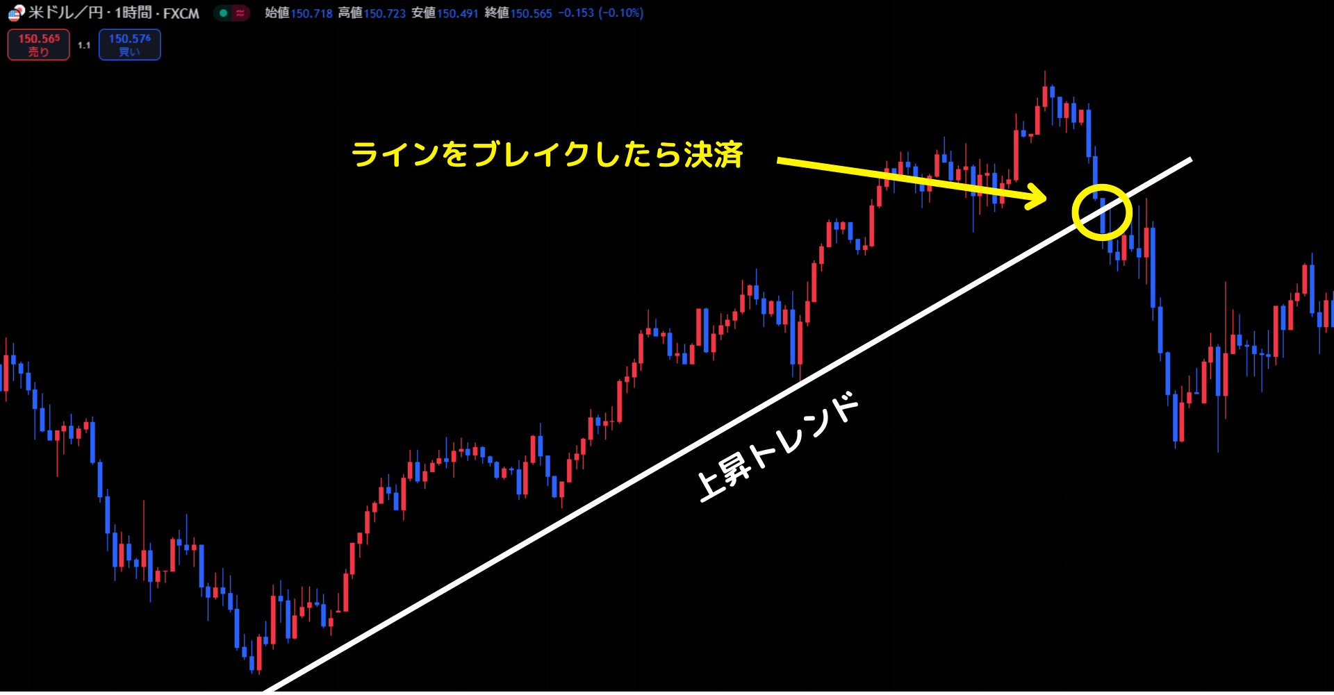 上のチャートではトレンドラインを下にブレイクしたのを確認できたら、トレンドの終了と考え決済をします。