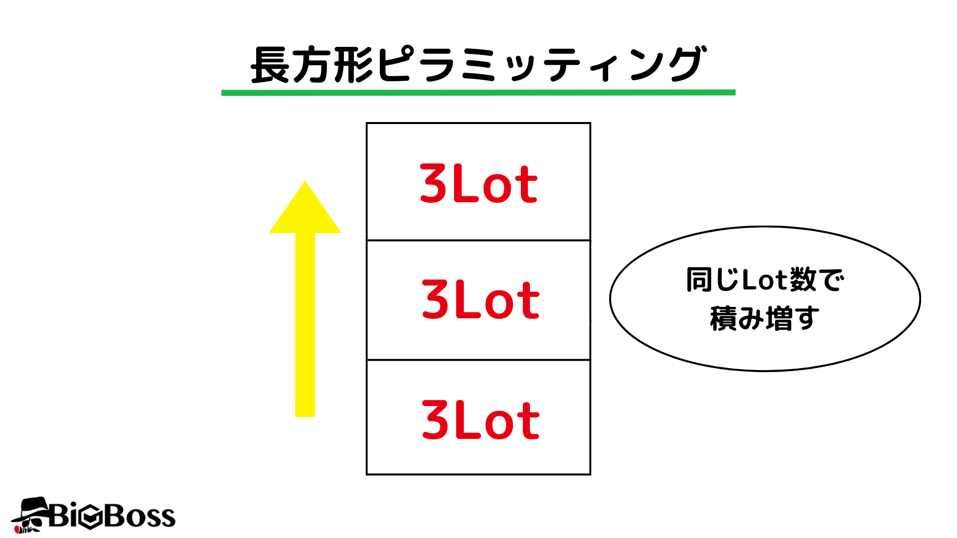 長方形ピラミッティング(イコールポジションピラミッディング)とは、追加で増やしていくロットを最初にエントリー際のロットと同じにする方法です。