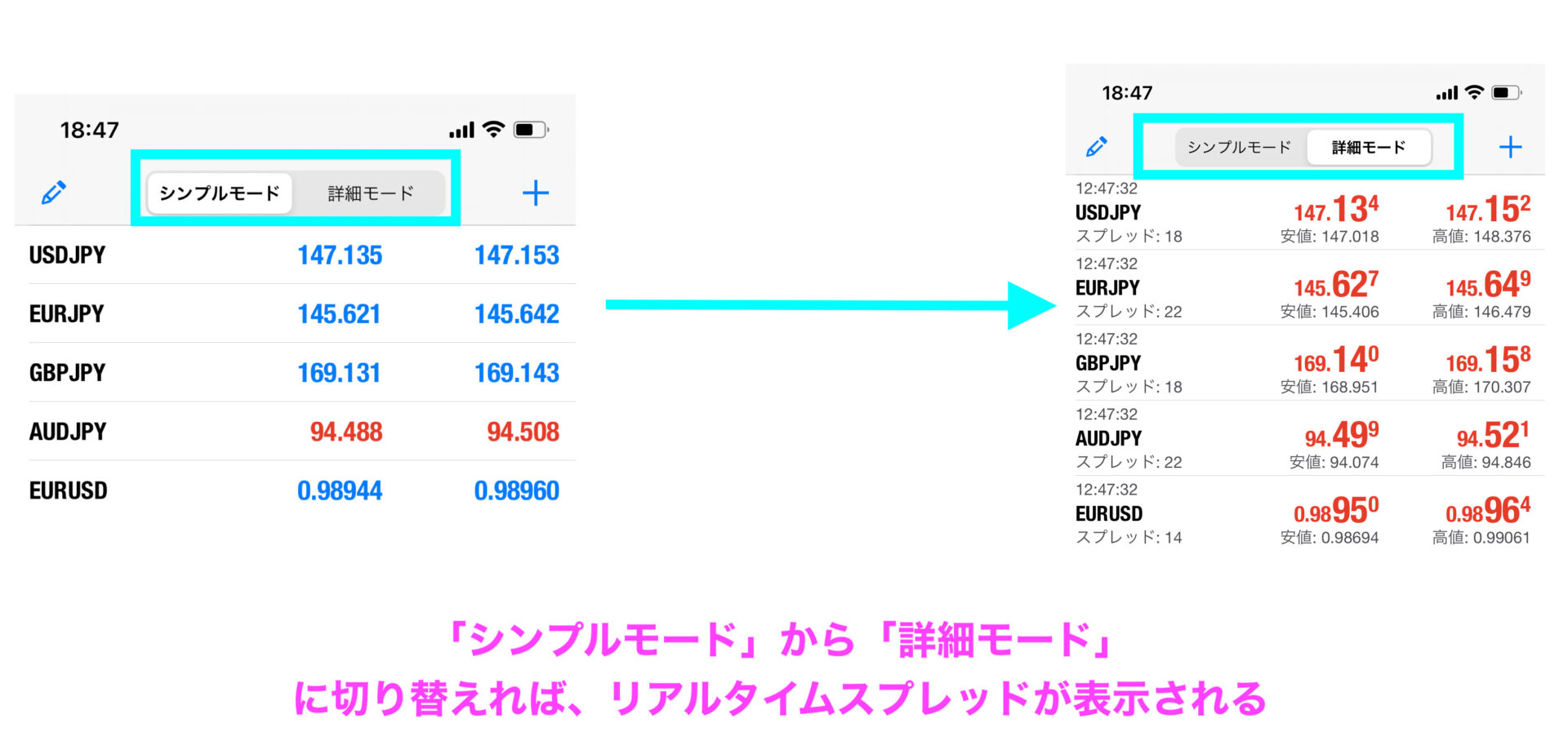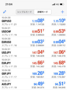 スマホ版MT4でリアルタイムスプレッドを確認する場合、画面上の「シンプルモード」を「詳細モード」に切り替えるだけでできます。