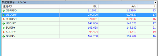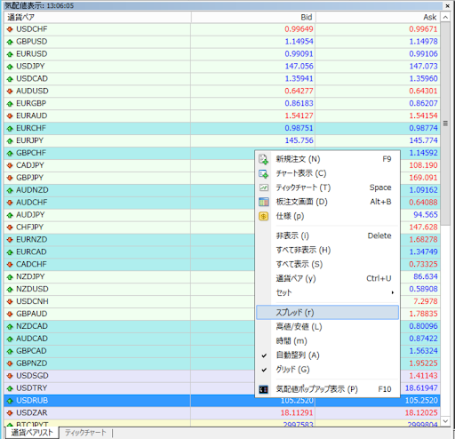 パソコン版MT4でリアルタイムスプレッドを確認する場合は、画面左にある気配値表示のどこでも良いので右クリックしましょう。