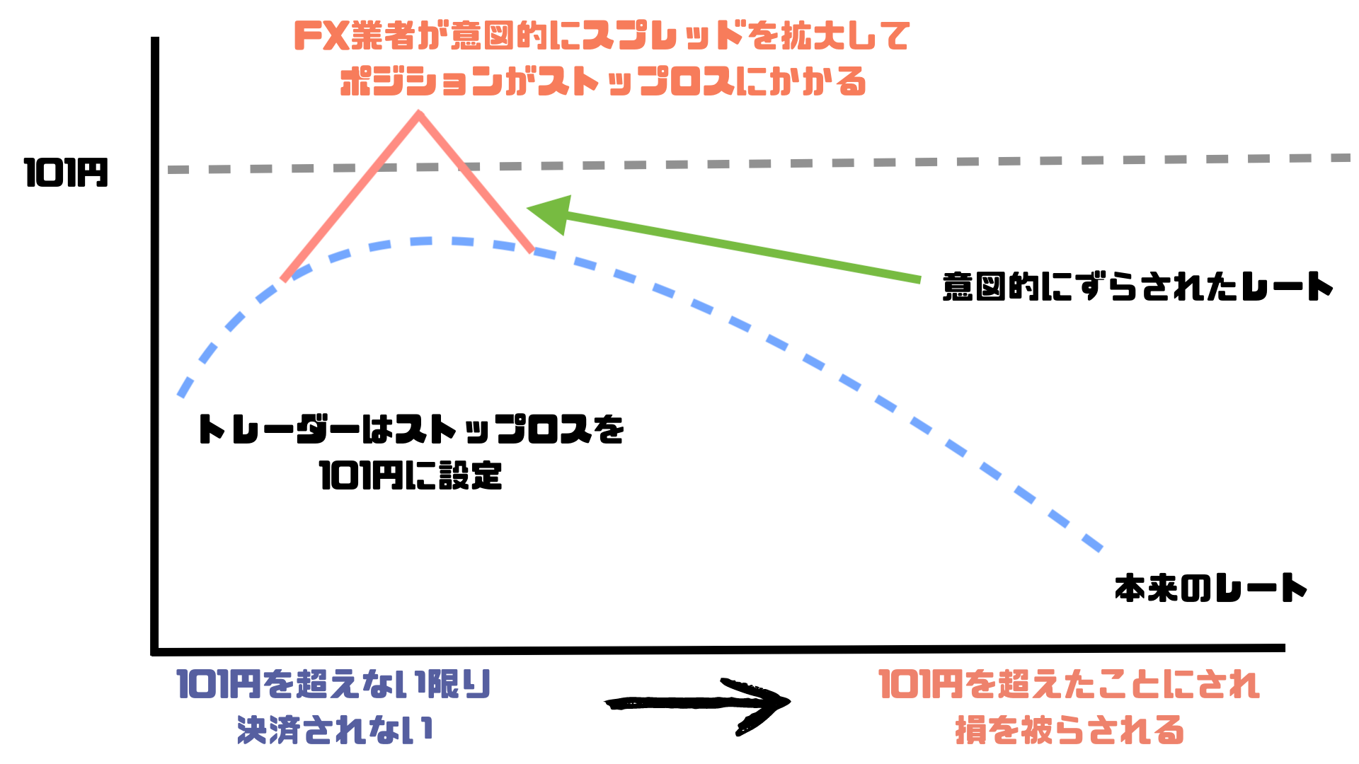 また、FX業者が意図的にスプレッドを拡大させて、多くのトレーダーのストップロス(自動的な損切り)が発生するように仕向けて利益を得る手法もあります。