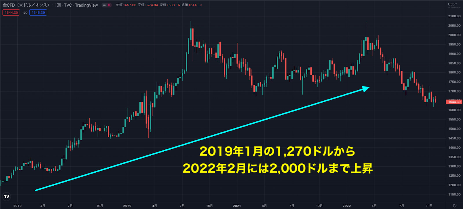 2019年1月時点でゴールド/ドルの価格は1,270ドル台でしたが、2022年2月には2,000ドルを超えています。つまり、約3年間で約1.6倍になっています。