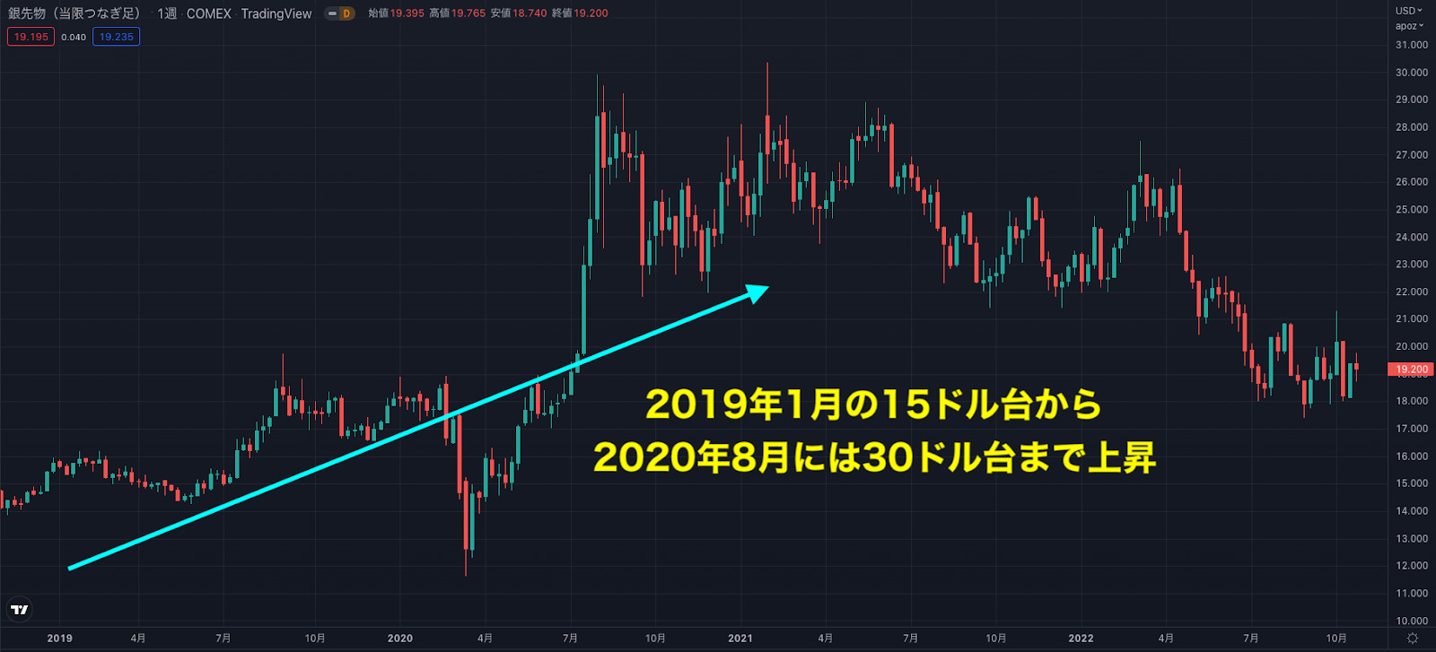 一方、シルバーの価格はどうなのか、同時期のチャートを見てみましょう。