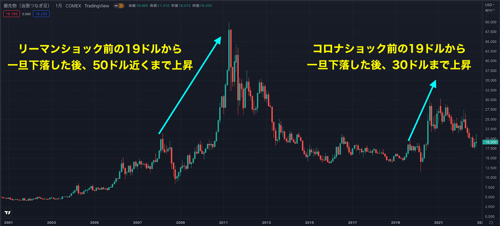 シルバーの価格は、リーマンショックやコロナショックの後に暴騰しています。