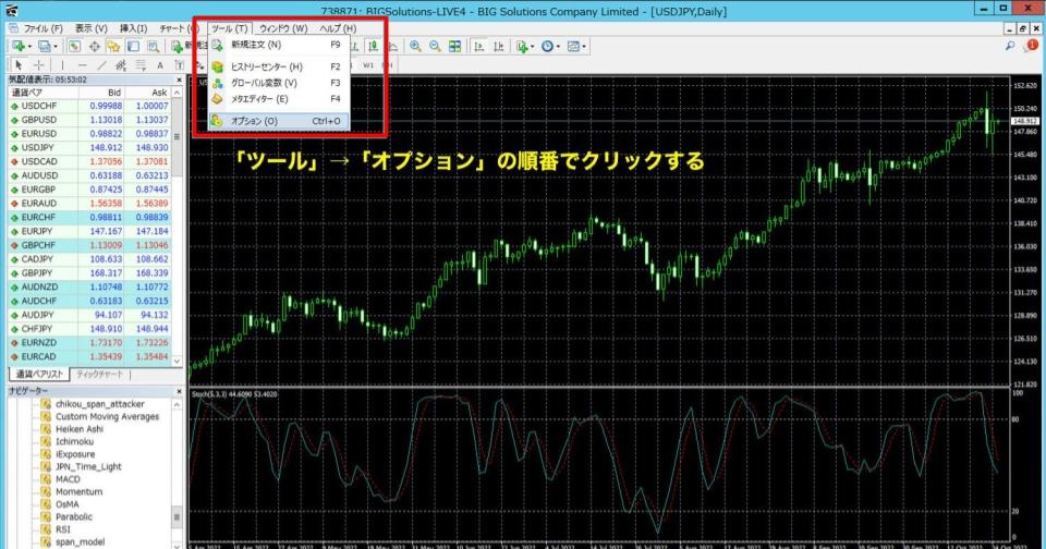 スリッページの許容幅を設定する際は、MT4やMT5にログインして、「ツール」→「オプション」の順番で選択します。