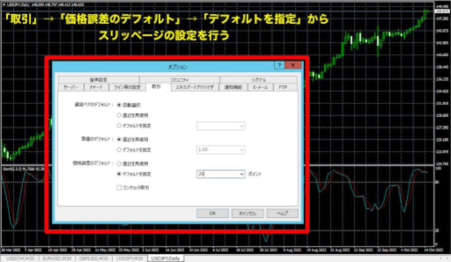 スリッページによる不利なレートでの約定を避けるためには、MT4やMT5でスリッページ許容幅を狭く設定しましょう。