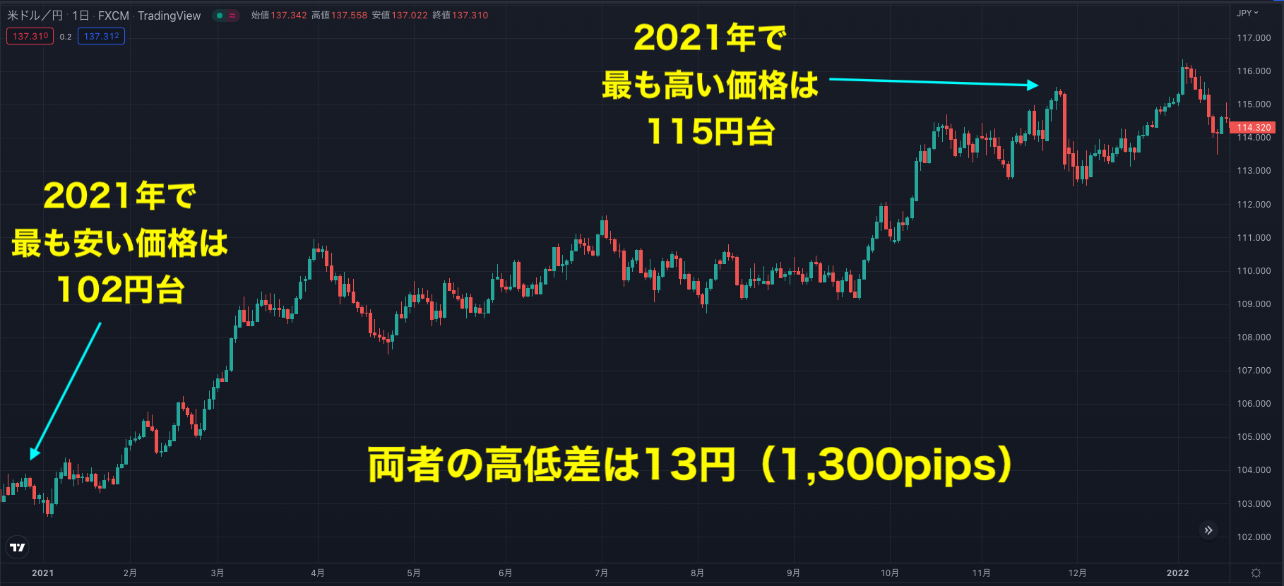 というのも、FXの通貨ペアの高低差はそこまで高くありません。以下は2021年のドル円のチャートですが、最も安い価格と高い価格から算出される高低差は13円(1,300pips)です。