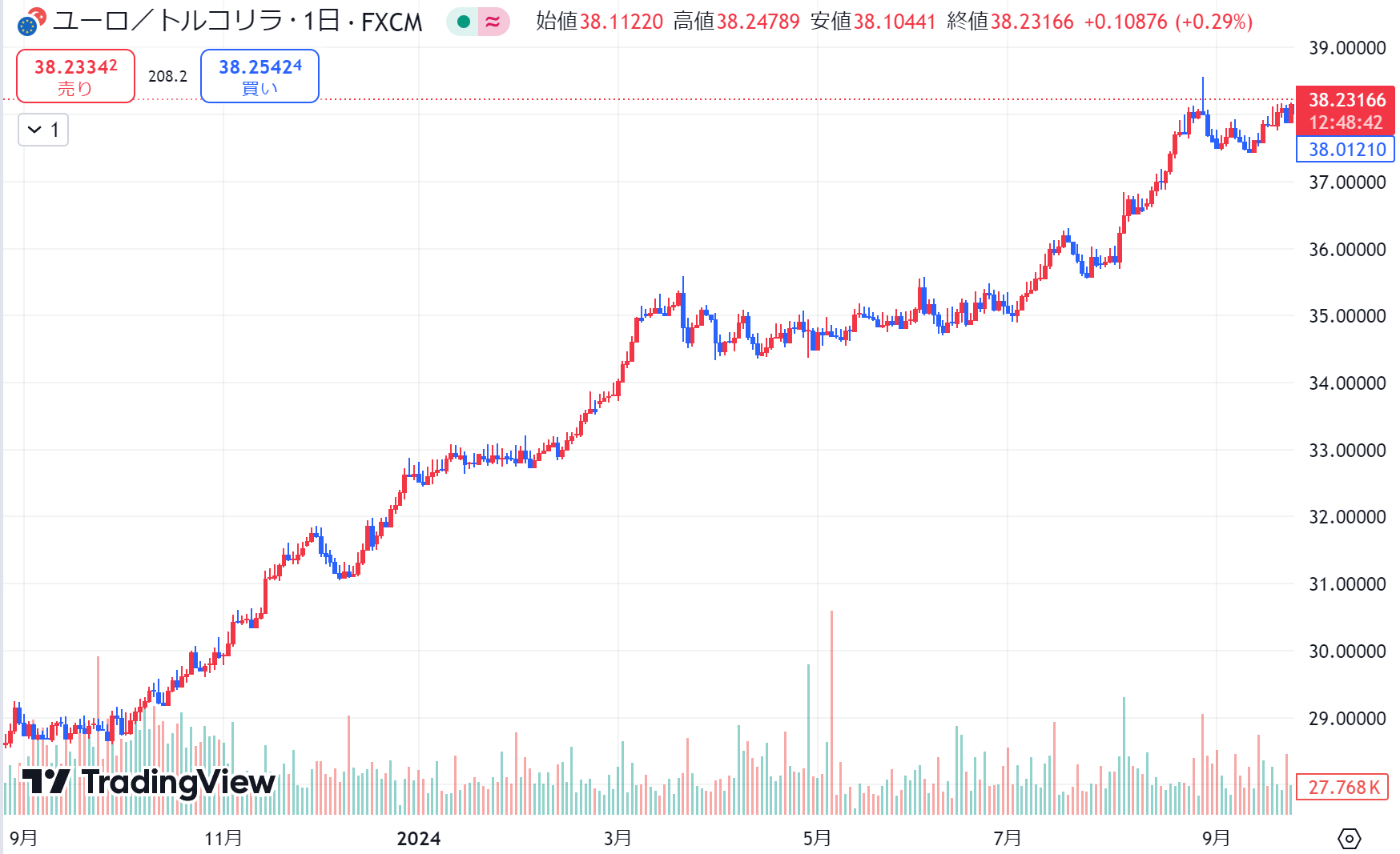 2024年9月30日17時時点は、1ユーロあたり約38.231トルコリラとなっており、過去1年分の高値は以下のように推移しています。