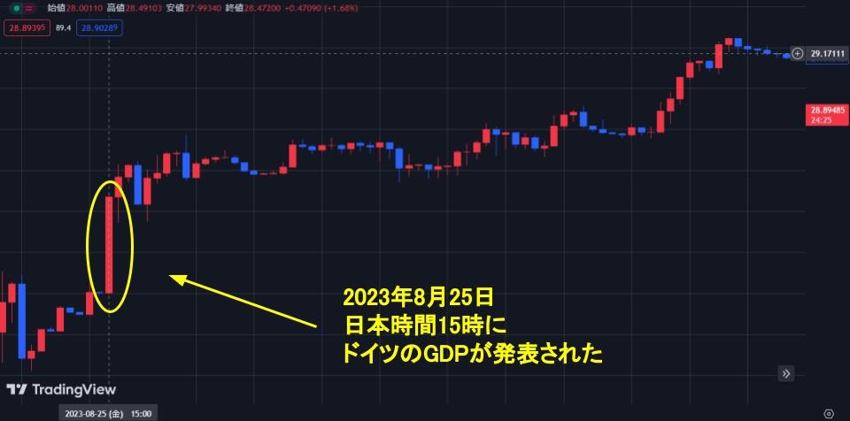 下図は、ユーロ/トルコリラの為替レートで、ドイツのGDPが発表された2023年8月25日15時(日本時間)に大きな値動きが確認できます。