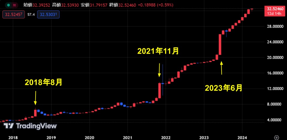 このデータからユーロ/トルコリラは、2023年9月から約1年かけて為替レートが1.3倍になっており、長期的な上昇トレンドが続いていることがわかります。