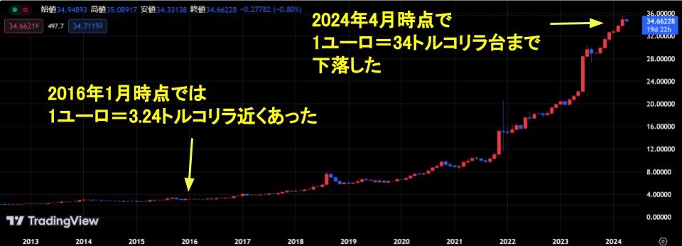 下図は、2017年7月から2024年4月のユーロ/トルコリラの為替レートです。