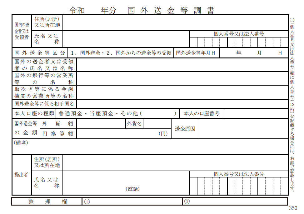 金融機関などを通じて国内外へ送金する場合、送金を受けた金融機関が税務署長へ提出するために作成する書類のこと。