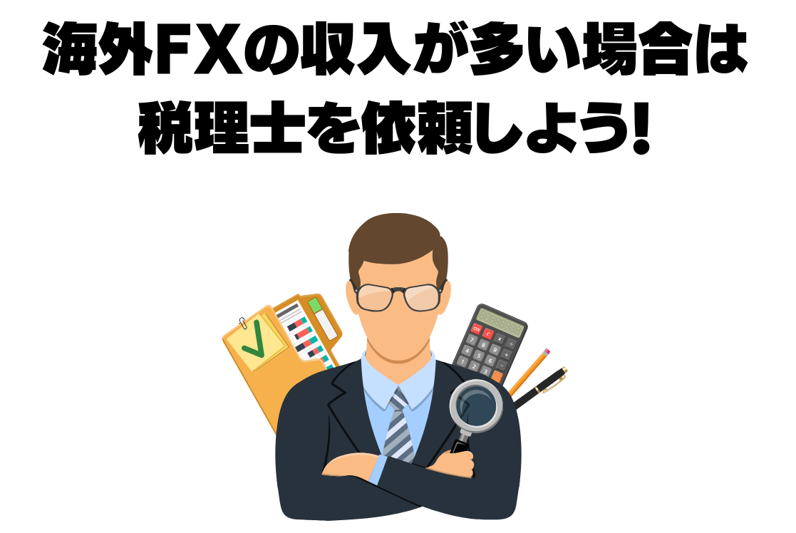 そのため、海外FXの収入が多い人は税理士を雇いましょう。税理士を雇えば、確定申告全般の手続きや節税対策のアドバイスを受けられます。