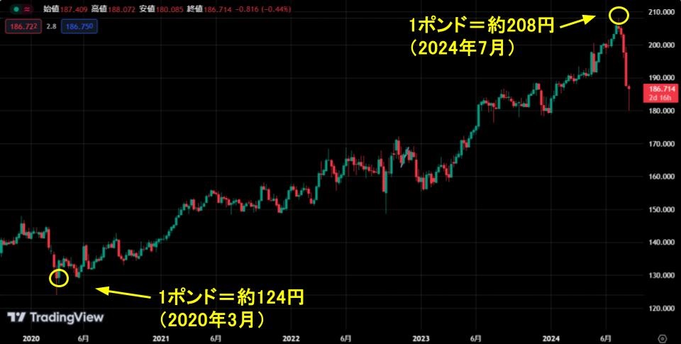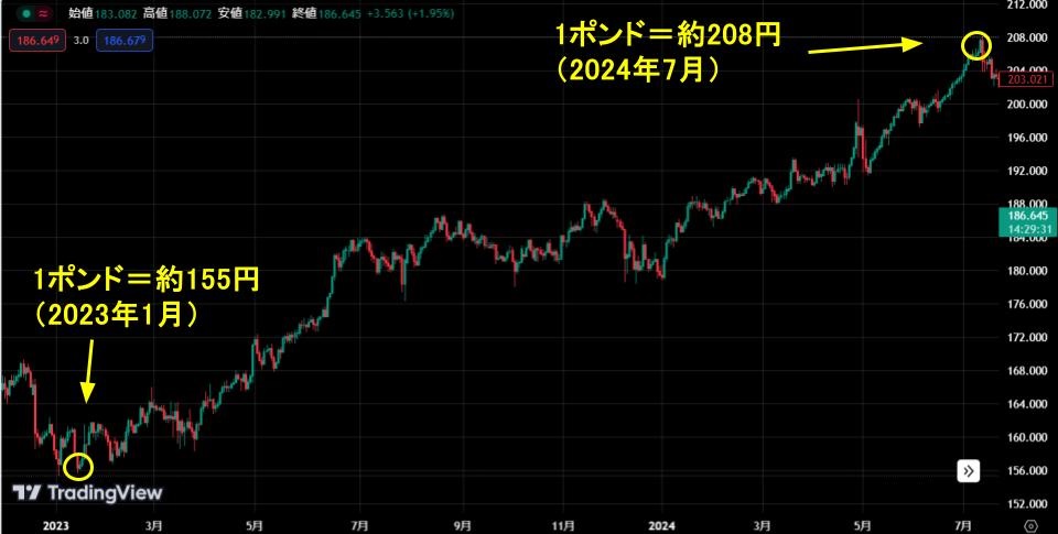 その結果、2023年から2024年7月頭まで円安ポンド高の傾向が続きました。